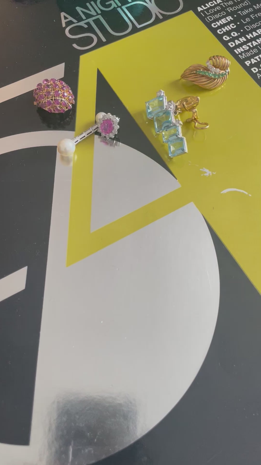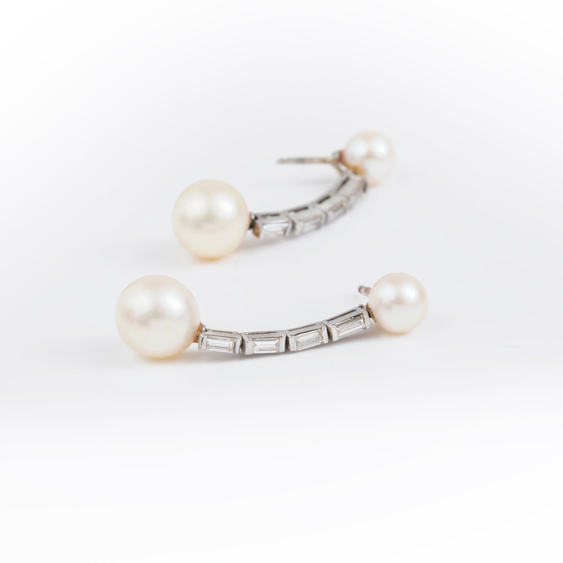 Paire de pendants d'oreilles en or gris (18k) retenant chacun 2 perles de culture Akoya séparées par 4 diamants naturels taille baguette.